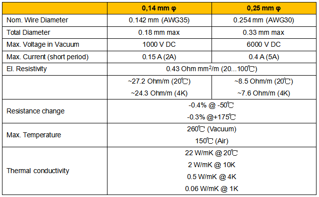 低温锰铜线缆带Kapton绝缘层,锰铜线缆是Cu-Mn-Ni合金作为导体部分,具有高电导,低热导的特性。两种线缆直径:0.14 mm和0.25 mm。